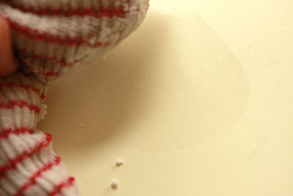 5. Now rinse off the baking soda by wiping down the table or wall with a hot soapy washcloth. I just dip the soda washcloth back in the sink and then wring it out.