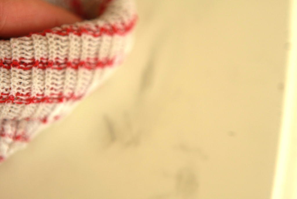 After they cleaned up their crayons and pencils, I was left with crayon marks and smudges from the lead pencils all over my painted cream table. A washcloth with hot soapy water just couldn’t cope with the mess.