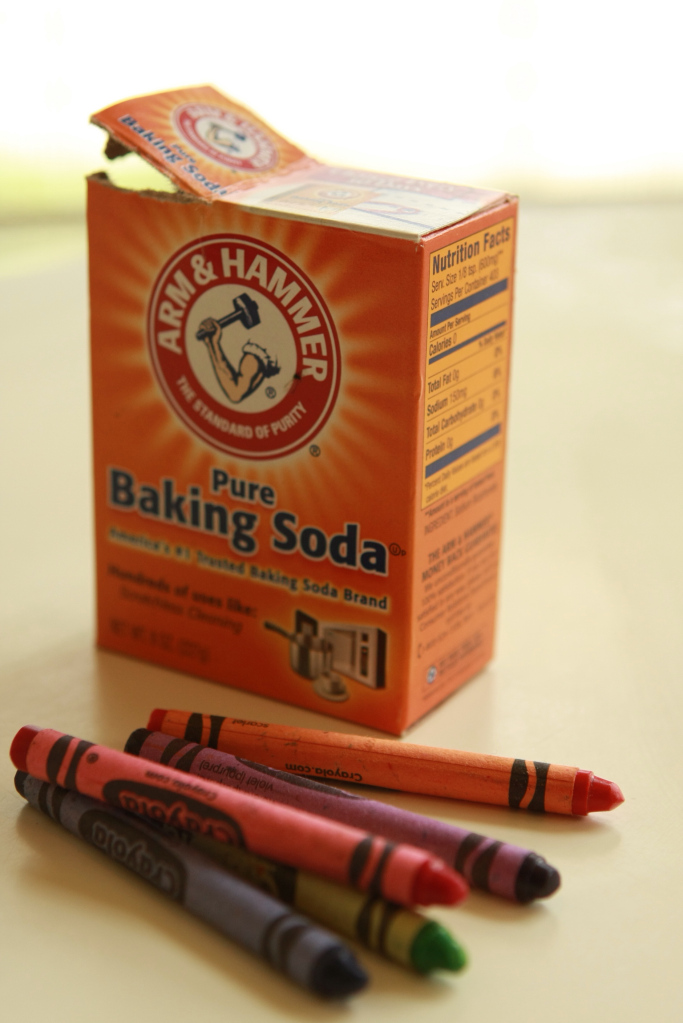 Baking soda works wonderfully well on crayon marks, is very cheap, and safe for the environment– and it’s always in my cupboard.