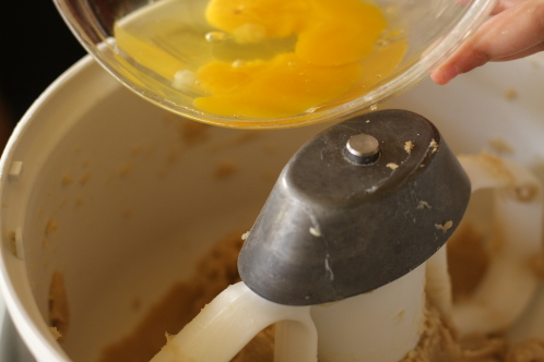 Add in 2 eggs. Ben is still learning to crack eggs and hates when he breaks the yolks. I’ve cracked hundreds… heck… probably thousands of eggs and I still break a yolk on occasion. No big deal especially when it’s going in to cookies. I’ve taught my kids to crack eggs into a small glass bowl, instead of directly into the cookies. That way if they have any stray shell in the egg, it’s easy to see and pick out. It adds a bowl for washing, but it really beats shell in your cookies.