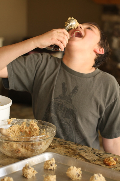 The only trouble is, Oatmeal Scotchies aren’t exactly Ben’s favorite cookie. He loves chocolate chips. So he pulled out some of the dough and added chocolate chips for himself. The rest were for his Dad… butterscotch all the way. (These are one of my favorite cookies made with Craisins… but I wasn’t about to ask Ben to make a third variety.)
