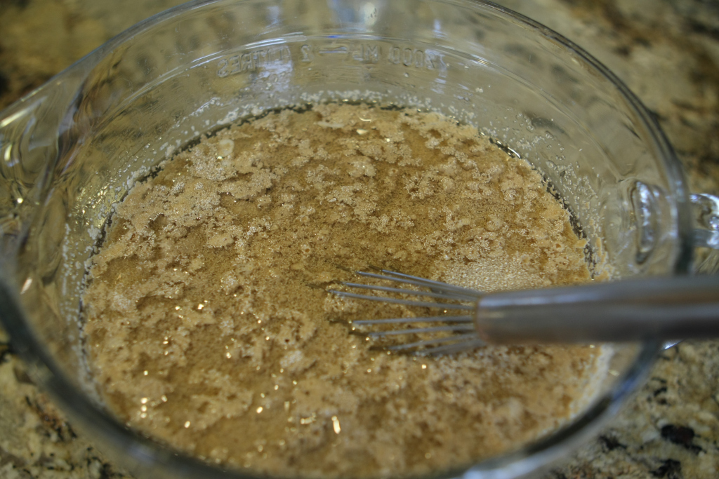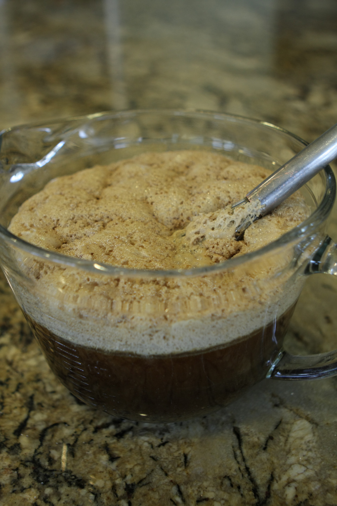 1.  Mix warm water, sugar, salt, oil, and molasses.  Your water should be about a 110 degrees.  You can test it while you are learning with a candy thermometer if you are unsure.  I think of it as baby bottle warm- too cold and the yeast won’t activate and you will kill the yeast if it is too warm.  Sprinkle yeast on top, stir once and let rest a few minutes until the yeast is dissolving and has a bubble effect (see second picture.)