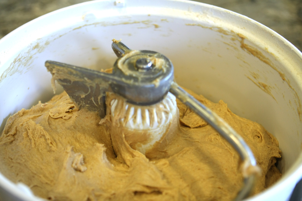 3.  Mix dry oatmeal, wheat germ and and enough flour to reach a thick pudding consistency.  (Think yummy butterscotch pudding.) (Sidenote:  You can use all whole wheat flour in this recipe, or you can use 3 cups of white for a lighter textured bread.)
