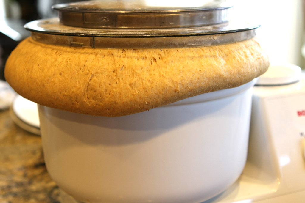 7.  Making sure the lid is loose on your mixer (or it can break,) let rise until dough is very soft to the touch, about 30 minutes.  I thought you would get a kick out of the picture above.  That is what happens when you run to go pick up kids while making bread and the dough over rises.  It is forgiving though and I just gently turned on the mixer and it pulled it all back in.