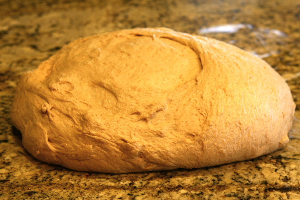 Grease counter with butter or shortening.  Turn dough out onto the counter and divide into 4 equal pieces.  Form loaves and place into 4 greased bread pans.  Let rise 20 – 30 minutes.  Do not let them over rise.  Bake at 375 degrees for 25 – 30 minutes.