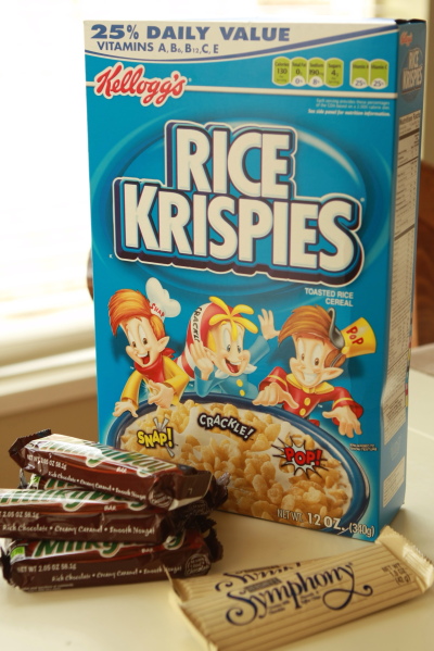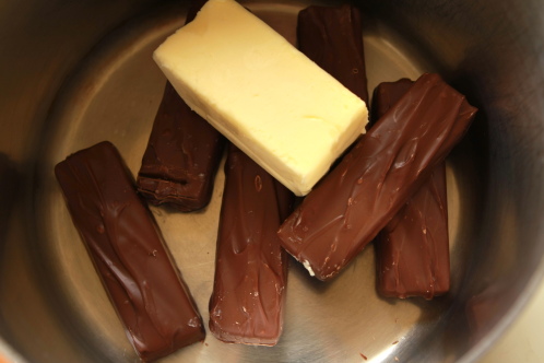 My son started by putting six regular-sized Milky Way bars in a medium sauce pan with a cube of butter.  I am pretending I didn’t see that so I can enjoy one later.