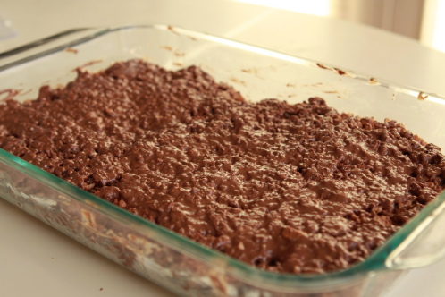 This recipe comes from his Auntie Jen.  He thinks his Aunties rock when it comes to chocolatey cereal desserts, actually he thinks his Aunties rock. Period.