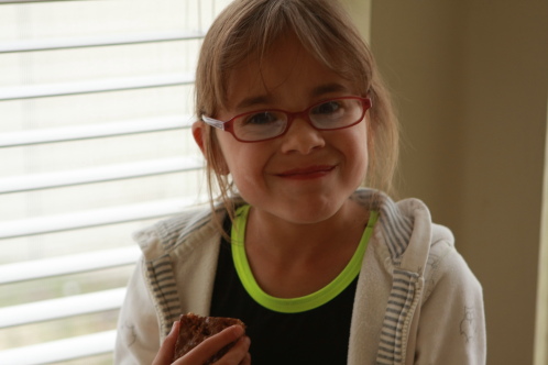 Then spread it out evenly into the pan.  He did help himself to a few bites, just to make sure it tasted OK.  It is the duty of the cook to check and make sure.