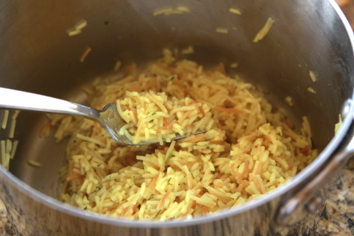 Hours before serving, cook your box of Chicken Rice-a-Roni, but reduce the amount of water called for by 1/4 cup. Time it for the shortest cook time suggested on the box… since it’s important not to overcook the rice.