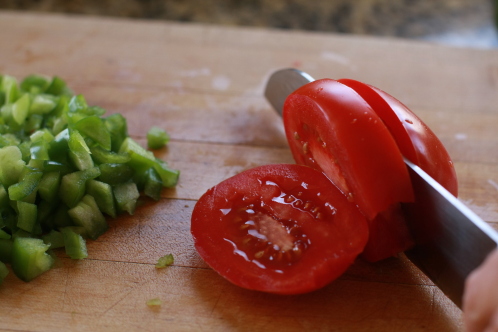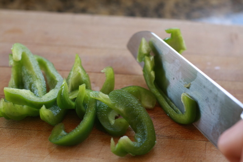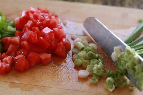 After several hours of chilling the rice, start prepping the vegetables. Chop 1/2 of a green pepper.