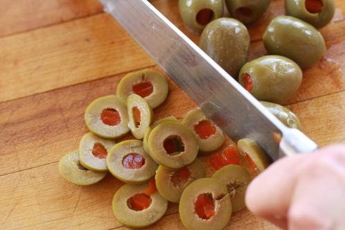 Slice 12 large Pimento Stuffed Olives (Spanish Olives).
