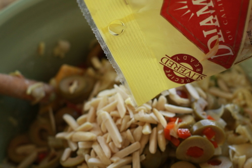 Add 1/2 cup slivered almonds and the rest of the ingredients to a large mixing bowl.