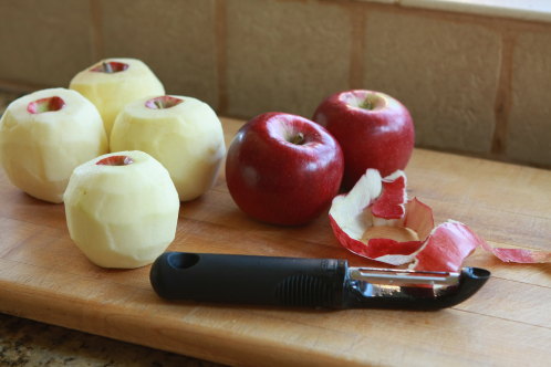 Peel, core, and slice 6 apples.  If my apples are small, I add one more.  Cut the apples in to nice bite sized slices.