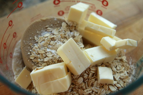 For the topping, add 1 cup flour, 1 cup brown sugar, 1/4 teaspoon baking powder, 1/4 teaspoon table salt, 2/3 cup rolled oats, and 1/2 cup cold butter that has been cut into small pieces into a mixing bowl.  I love my Pyrex 8-Cup Measuring Bowl, for when I use my pastry cutter, since it gives me a handle to hold onto while I work.