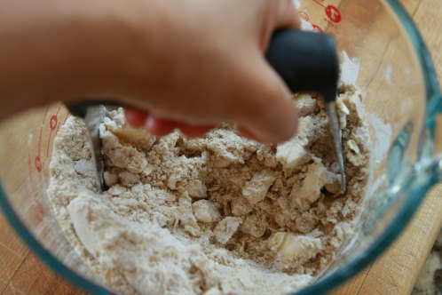 Cut the butter into the dry ingredients using a pastry cutter.  When the butter pieces are the size of small peas you are done.