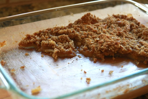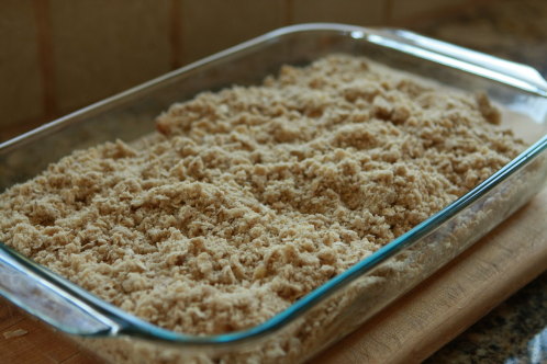 Pour the topping evenly over the apples.  And bake in a 350 degree oven for 40 minutes.  Your crisp will be golden brown.