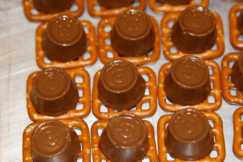 Start with Pretzel Snaps and Rolos candies (chocolate covered caramel candies). Place the Rolo in the center of the Pretzel Snaps and place in a 350 degree oven for 3 minutes.