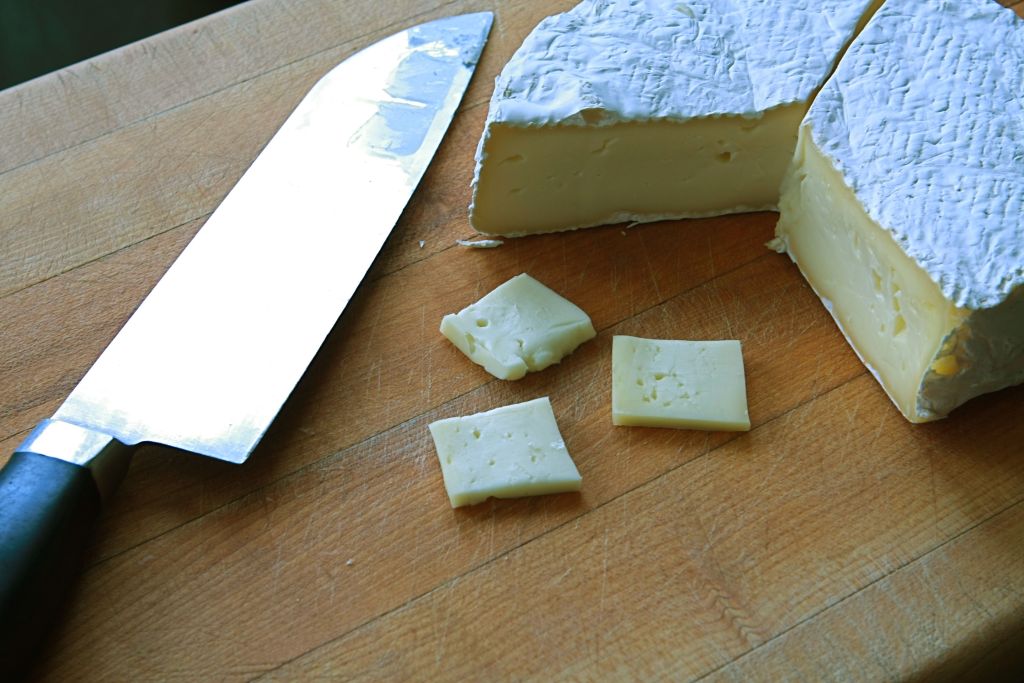 Cut small squares of Brie cheese. I remove the white rind, even though it’s edible, as the kids get a bit worried about the “mold.” Lay the cheese on top of the preserves in the cups.