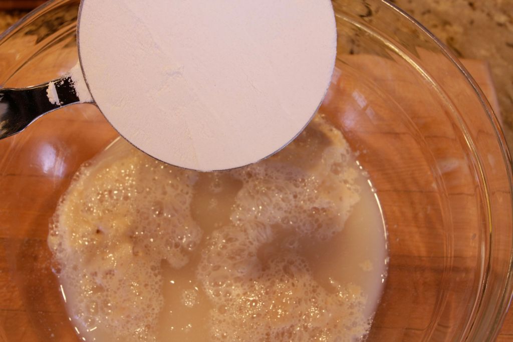 I always start my yeast in my measuring cup. Once active, I transfer to the mixing bowl. Add the flour.