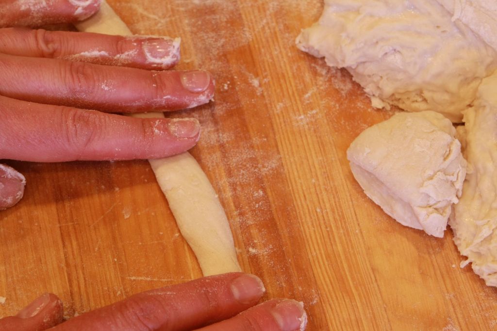 Roll each piece out into a bread stick roughly 8-9 inches.
