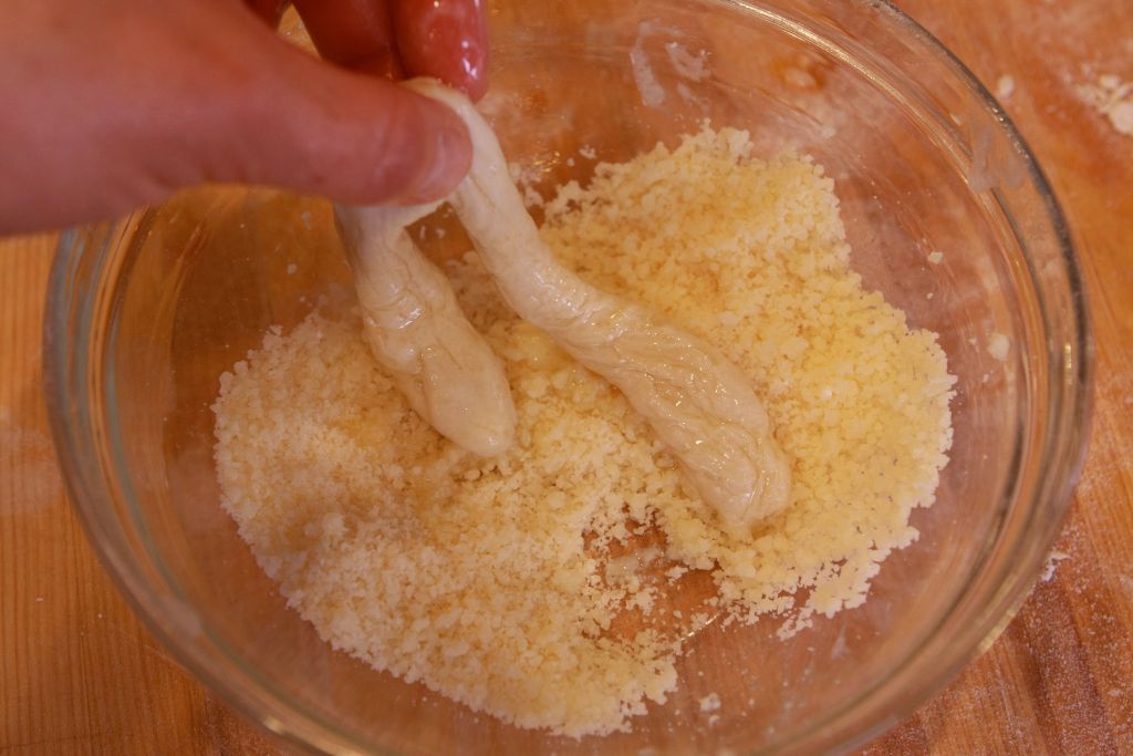 Dip into grated Parmesan cheese. If you want to save on cheese, you can also sprinkle it on.