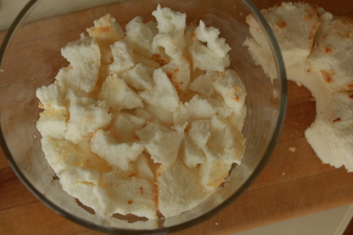 Tear up the cake into bite-sized pieces and arrange in the bottom of your trifle bowl.