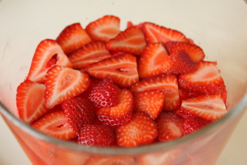 When the Jello/cake mixture is firm enough to start setting layers on – which is about 40 minutes or so, slice up some fruit.