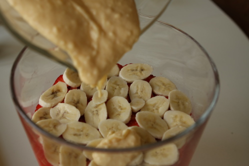 Start by making the custard. My husband always doubles or even triples the batch of pudding (4 -6 cups of milk) for a trifle. He doubled this last time and wished he had more so that the custard layer is more distinct. He also uses less sugar rather than more (there is a range on the recipe on the back of the can.) If you are American and you buy Bird’s… don’t be confused by the recipe which tells you to make the pudding “ON THE HOB”… that’s the stove top, folks.