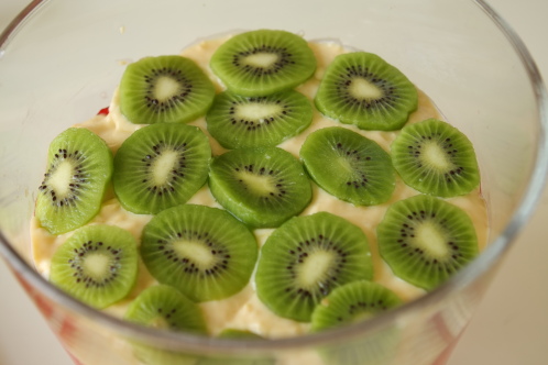 He separated the kiwis, ’cause he wanted to. There are no rules on how to layer your trifle. He also placed the strawberries around the edge flat against the bowl because they look nice.