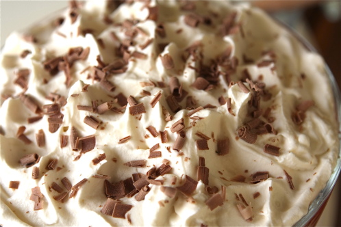 By this time you are getting to the top of the bowl. Spread fresh whipped cream over the top. I jumped in and did the “meringue peaks” thing with the cream. I love how that looks.