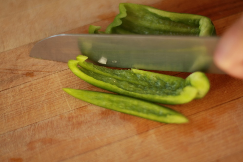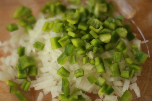 Chop up your peppers. About a 1/2 of a large green pepper. I also added one jalapeno… seeded to cut down of the heat a little. I chop the jalapeno very fine.