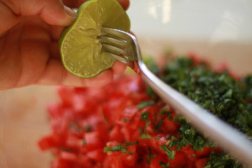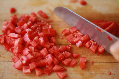 Next come the Roma tomatoes. I like Romas for salsa since they aren’t as runny. About 4 large Roma tomatoes fit the bill.