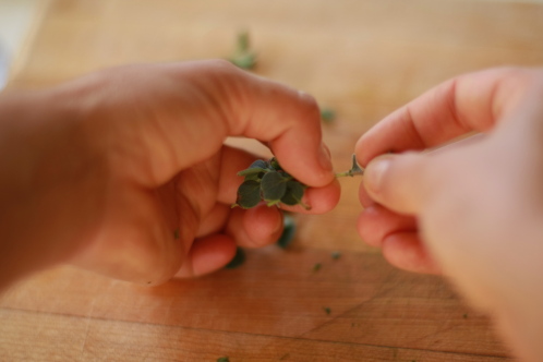 I run my fingers down the stem to remove the leaves and chop up about 1/2 teaspoon of fresh. If you don’t have fresh use about 1/8 teaspoon of dried.