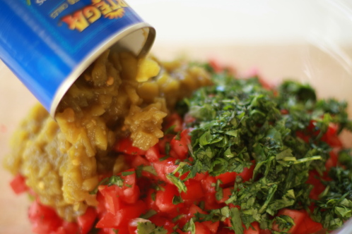 Canned diced green chiles go in next. If I’ve roasted fresh… that’s what I’d use. But not today. I especially like the hot diced green chiles.