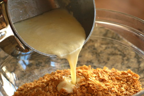 Pour 1/2 cup (1 stick) of melted butter over the cornflakes and stir well.