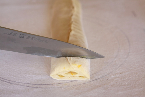 I like to pinch my roll to seal it. Then cut 1 inch slices with a sharp knife.
