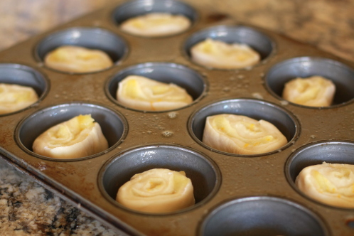 Place your rolls cut side down a well-greased muffin pan. Cover with a cloth and allow them to rise until about double.
