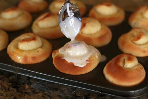 When your rolls come out of the oven, golden and lovely, spoon on the glaze while they are still hot.