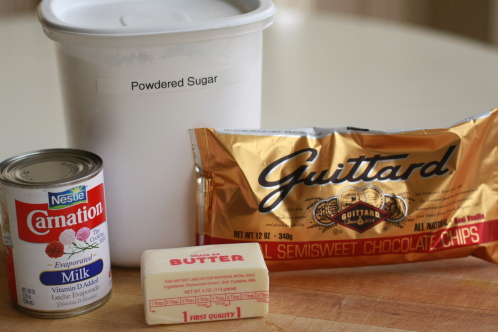 1/2 cup of butter (1 cube) 1 cup of good quality semisweet chocolate chips 1 (12 ounce) can of evaporated milk 2 cups of powdered sugar 1 teaspoon vanilla (optional) In a double boiler over medium melt the butter and chocolate chips, whisking constantly until combined. Whisk in the evaporated milk and powdered sugar and bring to a boil, stirring often, for 8 minutes. Remove from heat and add vanilla if desired. Store in a glass container in the refrigerator. Keeps for several weeks.Here’s the step by step: