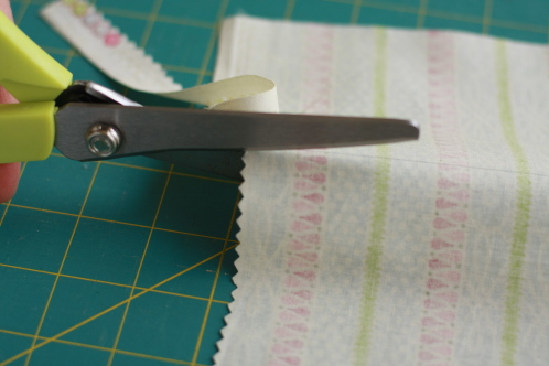 While the chocolate is cooling, I cut the fabric with my pinking scissors. I cut a 7 inch square for a wide mouth canning jar. It could be a little bigger, but I’m always trying to waste not. 7 inches is enough.