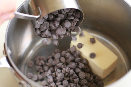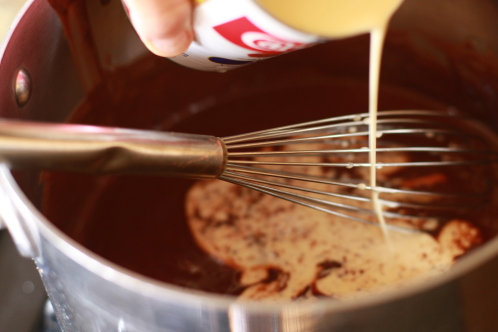 When the butter and chocolate chips are melted and combined, stir in the evaporated milk…