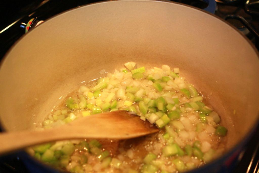 Start by sauteing the onions and celery in the bacon drippings. Season with 1 tsp. of salt and 1/2 tsp. pepper. One thing I want to say about soup recipes: The measurements are just guidelines. If you chop up an onion and there is 1 1/4 cups instead of the 1 cup required, I just throw the whole thing in. If I really like potatoes, add a few more. The measurement are just guidelines and not hard and fast rules like when baking.