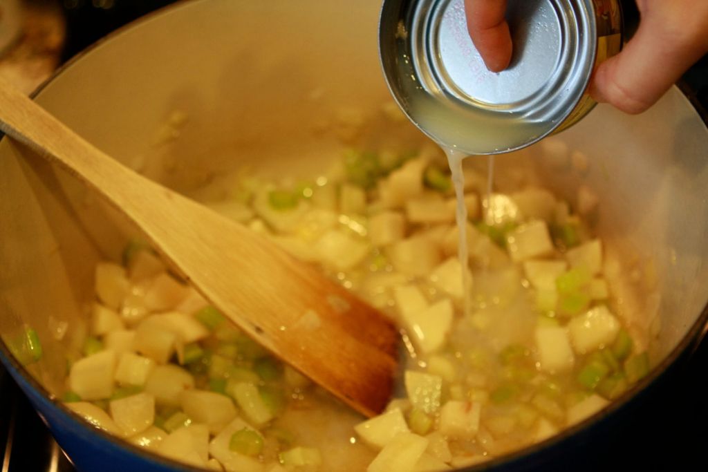 Start by sauteing the onions and celery in the bacon drippings. Season with 1 tsp. of salt and 1/2 tsp. pepper. One thing I want to say about soup recipes: The measurements are just guidelines. If you chop up an onion and there is 1 1/4 cups instead of the 1 cup required, I just throw the whole thing in. If I really like potatoes, add a few more. The measurement are just guidelines and not hard and fast rules like when baking.
