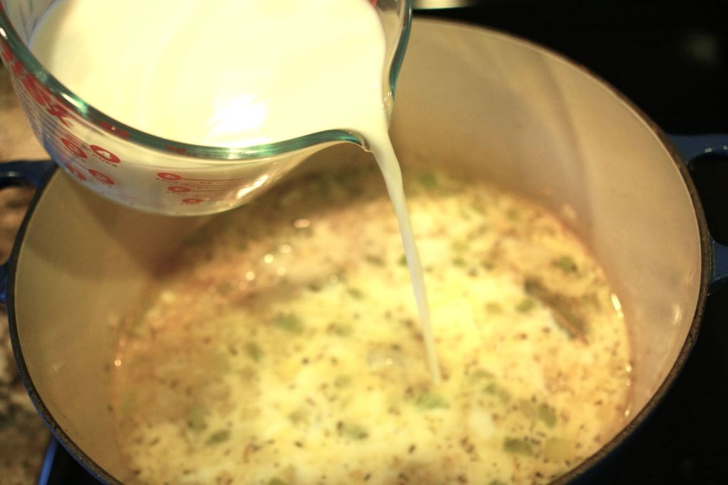 Add milk, flour mixture, bacon and clams. Heat gently until thickened. Don’t let it come to a boil. Check for seasoning and add salt and pepper as needed. It really depends on how salty my bacon is. A quick word about the milk. The higher fat milks make for a thicker, creamier soup. But if your watching what you eat, like me, the skim still tastes great.