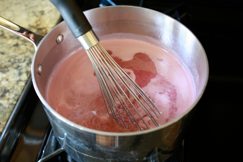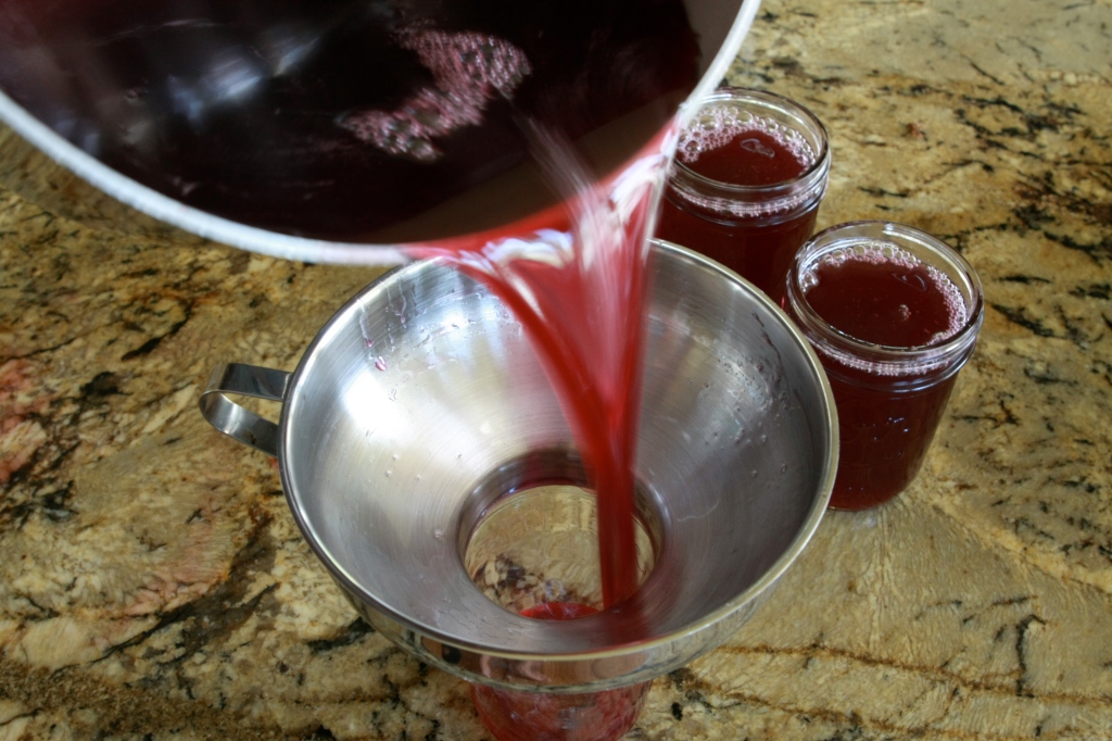Next, make the syrup. Add 6 cups of sugar to 3 cups of juice. (Yes I know, it’s a lot of sugar… but it is syrup after all!) Stirring constantly, bring syrup to a rolling boil and let it boil for 1 full minute. This will thicken your syrup… too long and it will be very thick…. not long enough and it’s too runny.