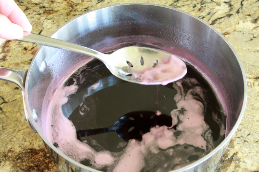 Using a slotted spoon, skim off the foam from the syrup. Don’t ask me why, but I find this job oddly satisfying. I love how the foam kind of sticks together…