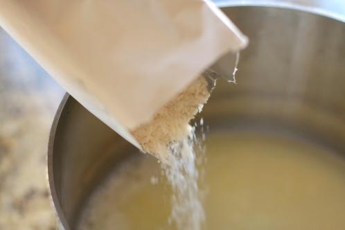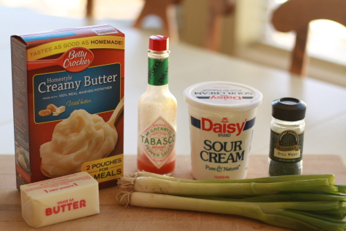 Next make the boxed potatoes – I used Betty Crocker Homestyle Creamy Butter for this batch. There are two packets in the box, and you just need one. Each packet makes about 2 cups, so there will be one cup left over. Either double the muffins if you have a big family, or make Potato Soup and throw the remaining potatoes in the soup. In just a couple of minutes you’ve got hot mashed potatoes.