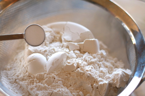 In a large mixing bowl, sift together the dry ingredients: 2 cups flour, 1-1/2 tsp. baking powder, 1/2 tsp. baking soda, and 1 tsp. salt.
