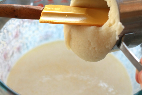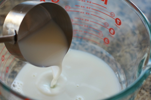 In a separate bowl add 3/4 cup milk and 1/4 cup (1/2 cube) melted butter,