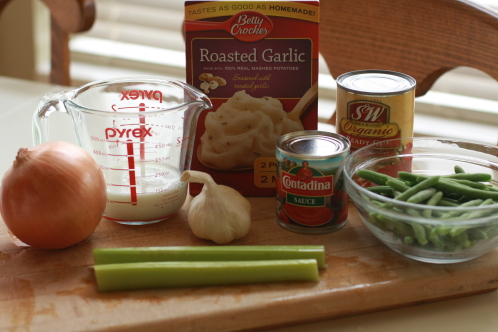 Here’s the beginnings of my meal: an onion, a few cloves of garlic, celery, green beans, tomato sauce, diced tomatoes, milk, and the Roasted Garlic Mashed Potatoes. You’ll also need a generous pound of hamburger and some nice sharp cheddar cheese.